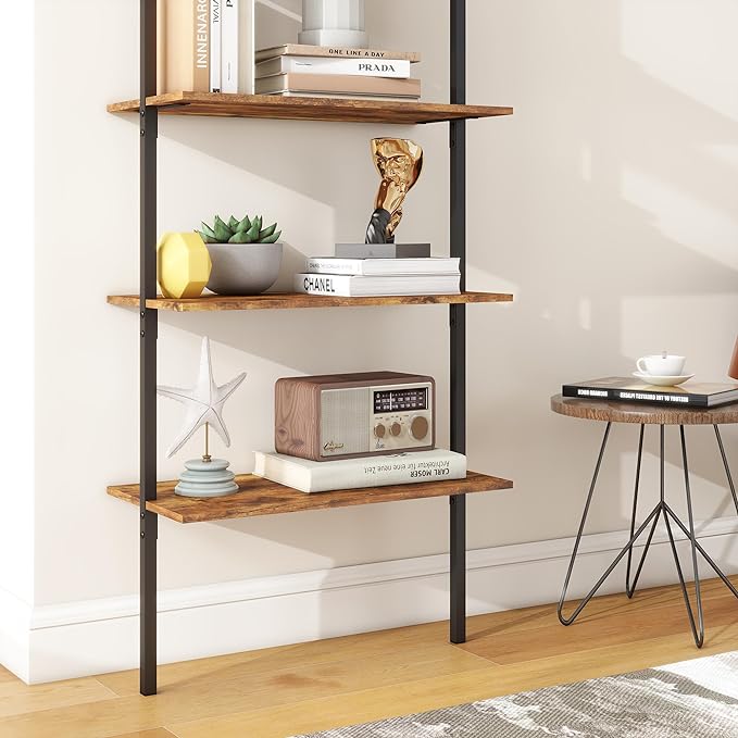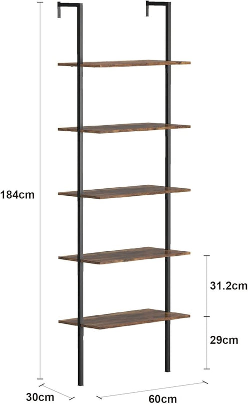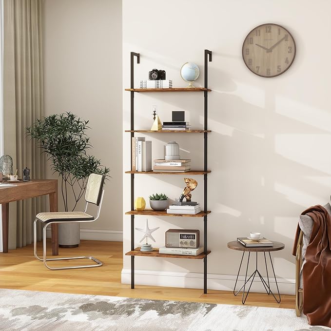 Panana Industrial 5 Tier Ladder Shelf, Open Space Book Shelf Wall Mount Bookshelf with Metal Frame Sturdy Bookcase for Living Room (Brown, 5 Tier)