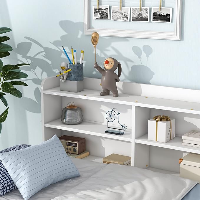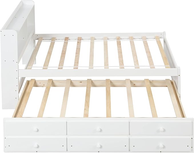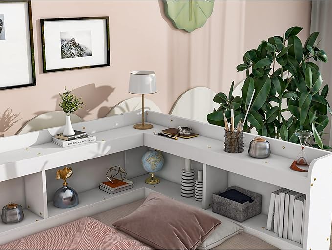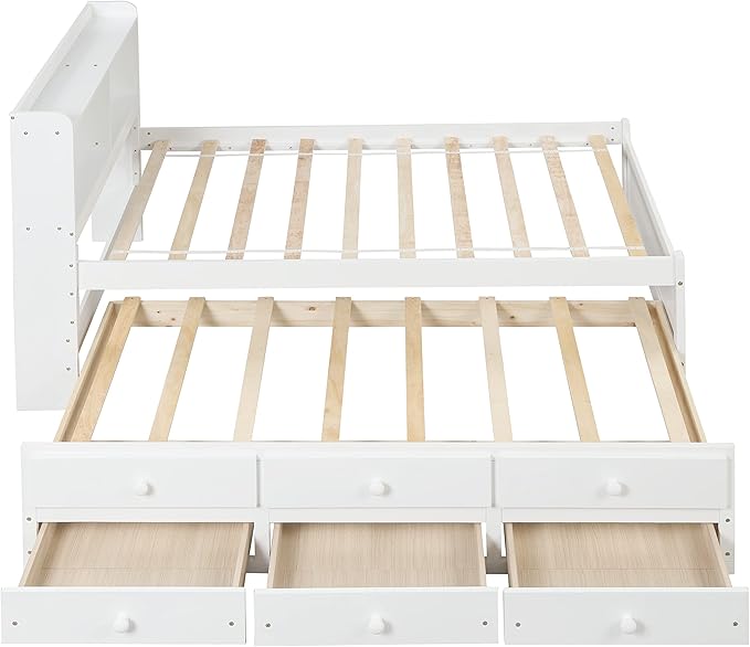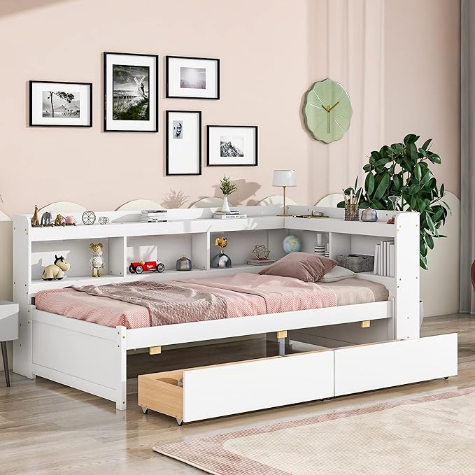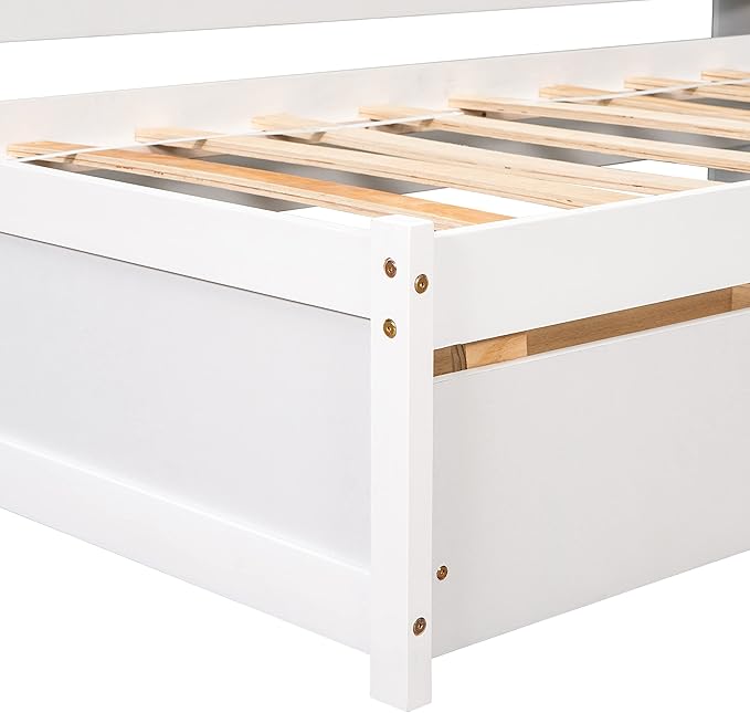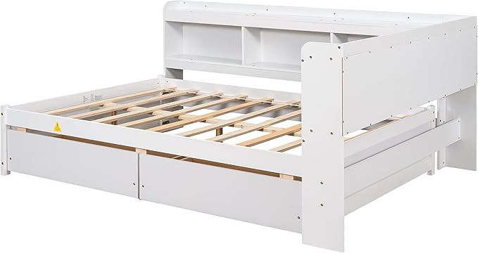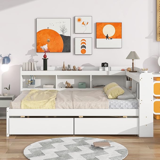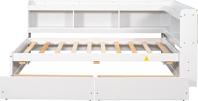 Full Size Bed with Storage Drawers and L-Shaped Bookcases, Wood Platform Bed Daybed Sofa Bed Frame with Headboard for Bedroom Living Room, White