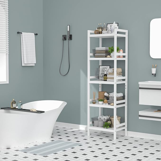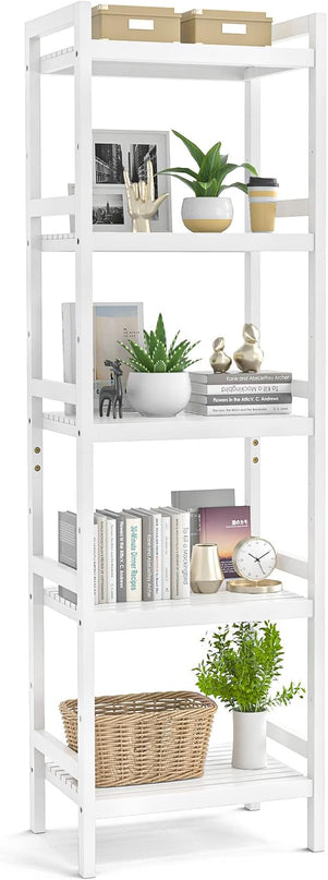 Homykic Bamboo Bookshelf, 5-Tier Narrow 55.9” Adjustable Book Shelf Bookcase Bathroom Shelves Freestanding Storage Stand for Living Room, Bedroom, Kitchen, Rust Resistance, Easy Assembly, White
