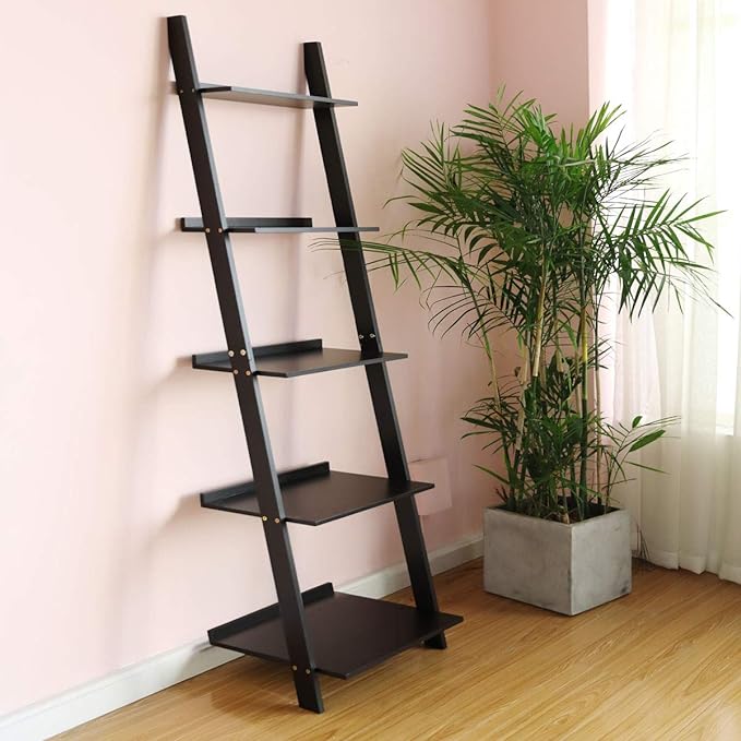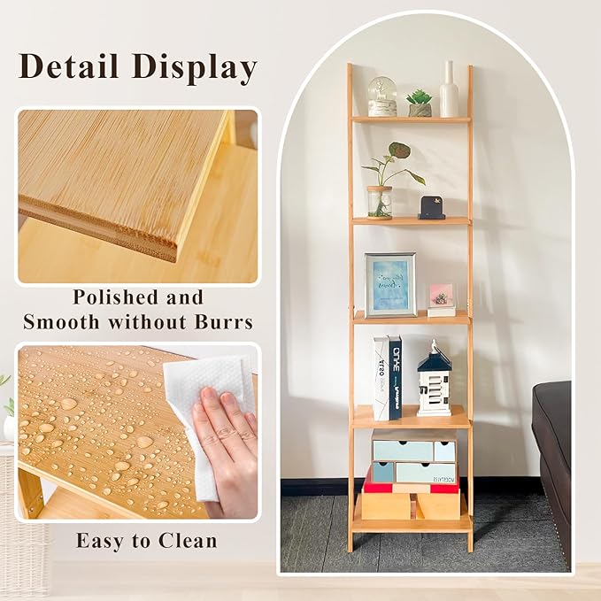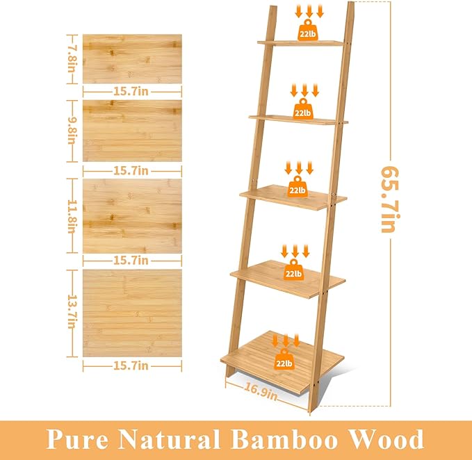 HYNAWIN Ladder Shelf Bookcase,5-Tier Bamboo Storage Rack Shelves Wall Leaning Shelf Unit,FreeStanding Plant Stand, Corner Display Shelves for Living Room, Bathroom, Kitchen, Office(65in)