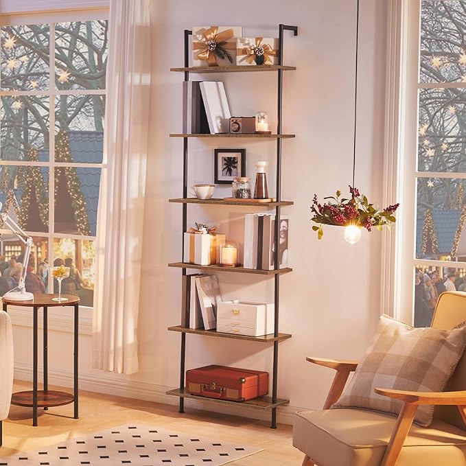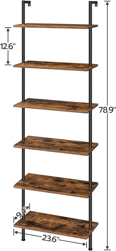 Panana 6 Tier Tall Modern Bookshelf, Industrial Ladder Shelf Open Space Wall Mount Bookshelf with Metal Frame Sturdy Bookcase for Living Room (Brown, 6-Tier)