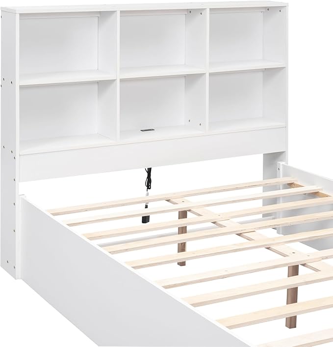 Full Size Platform Bed with Storage Headboard Bookcase, 2 Drawers Underneath and Charging Station, for Bedroom/Guest Room, White