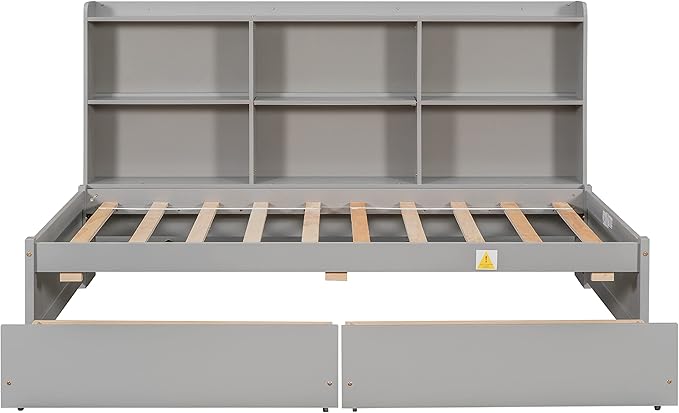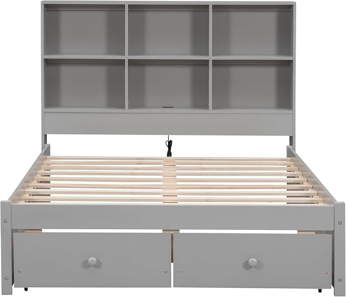 Full Size Platform Bed with Storage Headboard Bookcase, 2 Drawers Underneath and Charging Station, for Bedroom/Guest Room, Gray