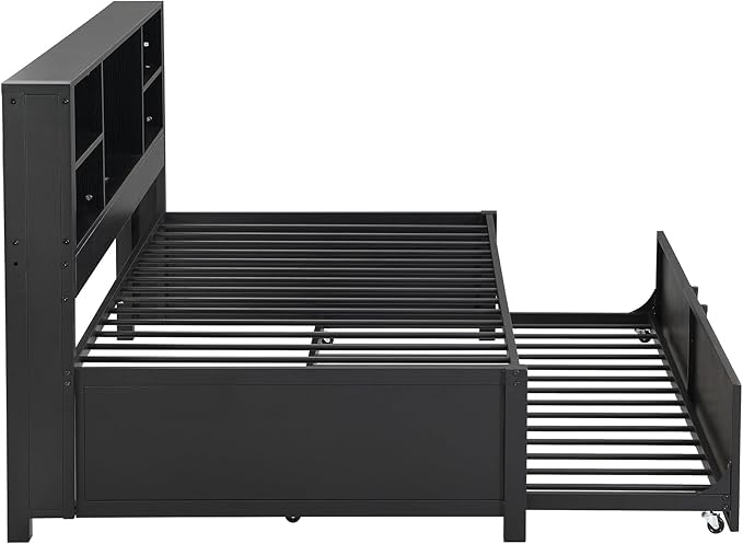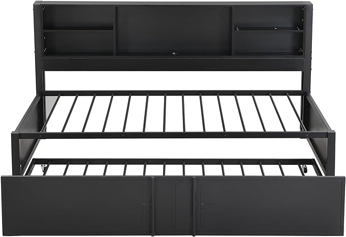 Metal Twin Size Daybed with Twin-Size Trundle, Storage Shelves and USB Ports, BookcaseMetal-Slats Support,No Box Spring Required,for Bedroom/Apartment/Guest-Room,Black