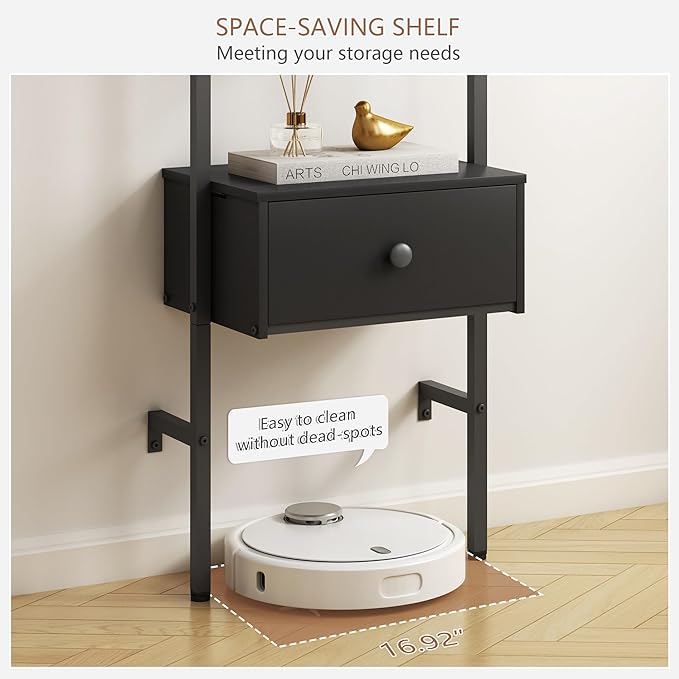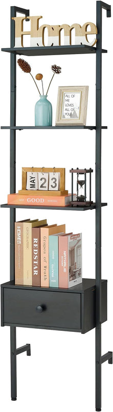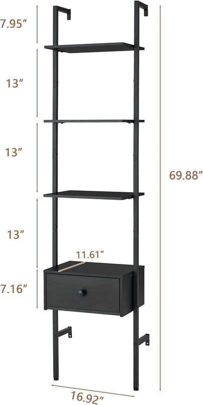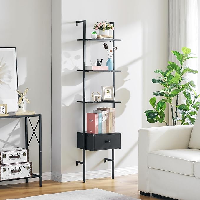Tajsoon Ladder Shelf, Tall Bookcase with Storage Drawers, 4-Tier Wood Wall Mounted Bookshelf, Open Display Rack, Storage Shelves for Bedroom, Home Office, Collection, Plant Flower, Black