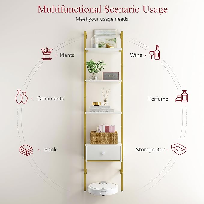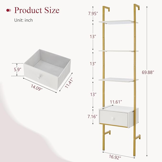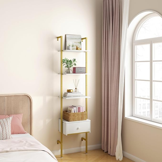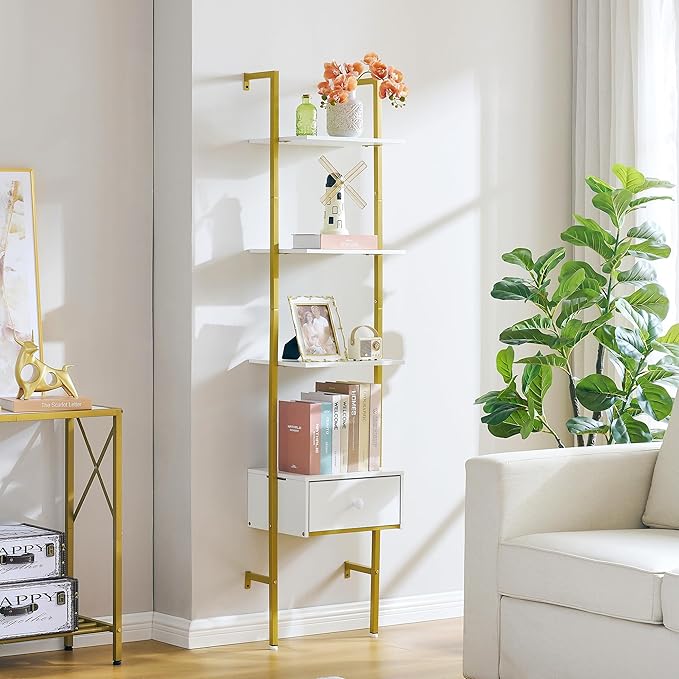Tajsoon Ladder Shelf, Tall Bookcase with Storage Drawers, 4-Tier Wood Wall Mounted Bookshelf, Open Display Rack, Storage Shelves for Bedroom, Home Office, Collection, Plant Flower, Gold & White