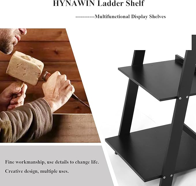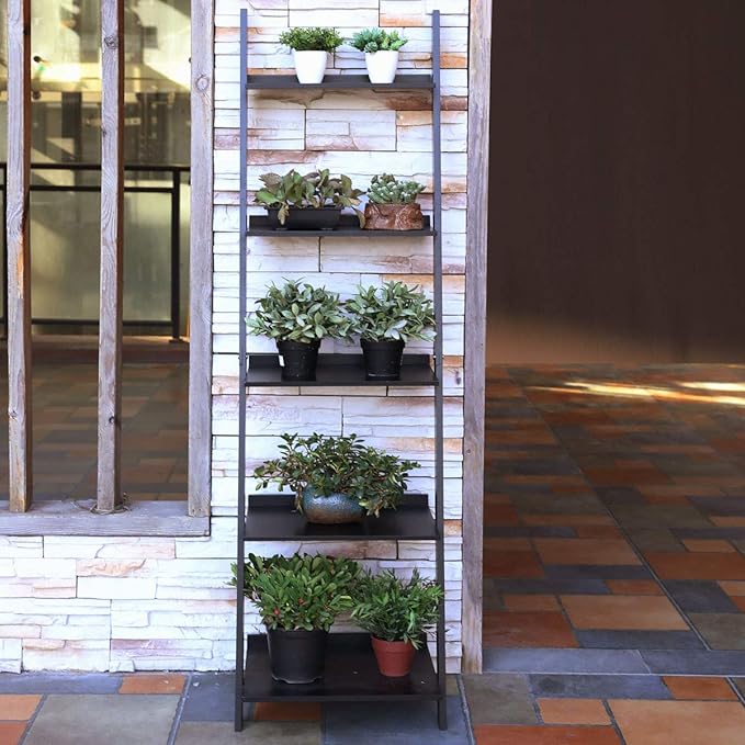 HYNAWIN 5 Tier Ladder Shelf-Wood & Metal Bookcase,Wall Mount Bookshelf Standing Unit,Multipurpose Plant Stand for Livingroom,Kitchen,Space Saving Display Rack,Industrial Accent Furniture