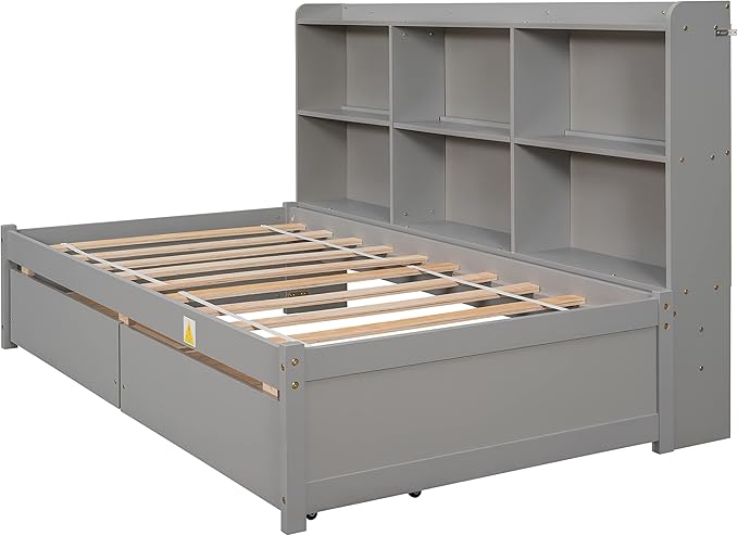 Full Size Platform Bed with Headboard Bookcase, USB Charge, Twin Trundle and 3 Drawers Storage, Wood Captain Bedframe for Bedroom Guest Room, Gray
