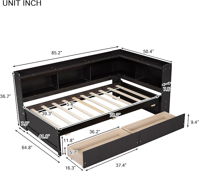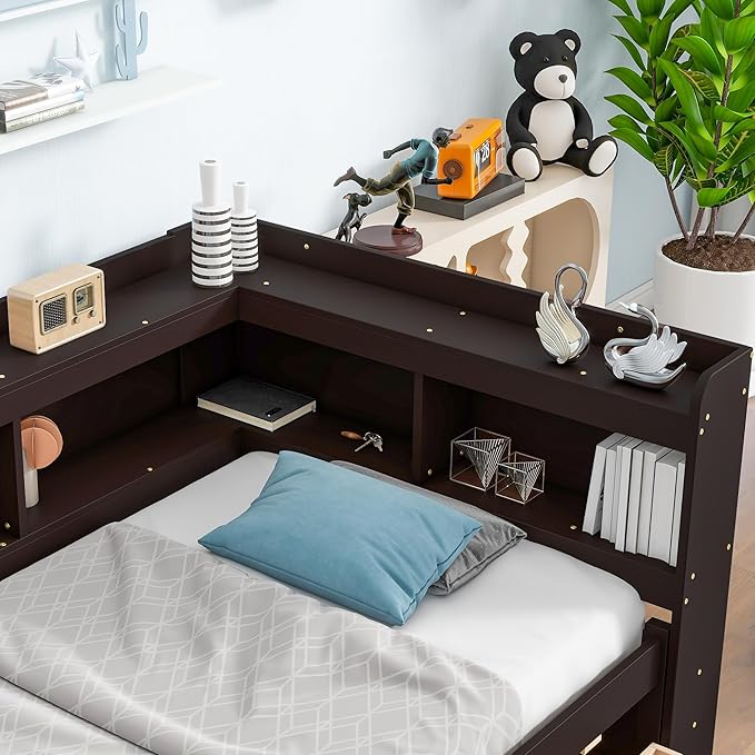 Twin Size Platform Bed with L-Shaped Bookcase and 2 Drawers, Wooden DayBed Bedframe with Storage Headboard for Bedroom Guest Room, Espresso