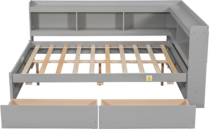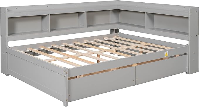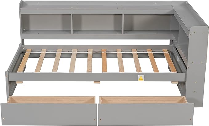 Full Size Platform Bed with L-Shaped Bookcase and 2 Storage Drawers, Wood Daybed frames with Headboard, Gray