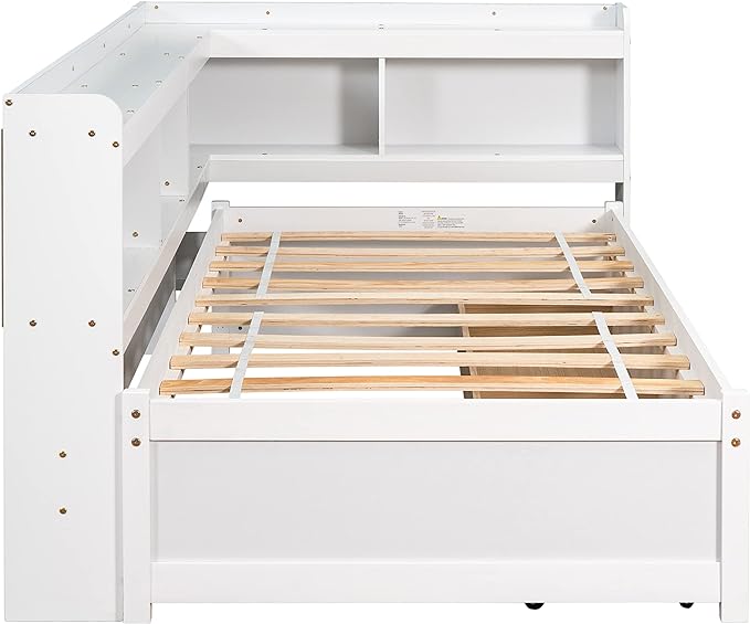 Wooden Twin Size DayBed with L-Shaped Bookcase Headboard and Trundle, Wood Twin Day Bed Frame with Storage Shelf and USB Charging Ports for Living Room Bedroom, White