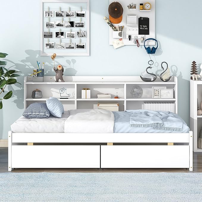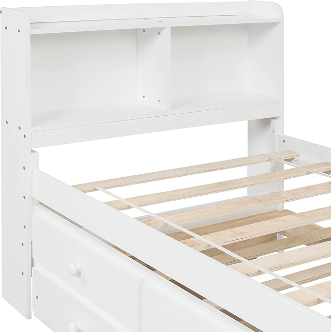 Twin Size Platform 2 Storage Drawers and Side Bookcase, Solid Wood Day Captain, Ideal Bed Frame for Bedroom, Living Room, White