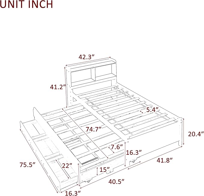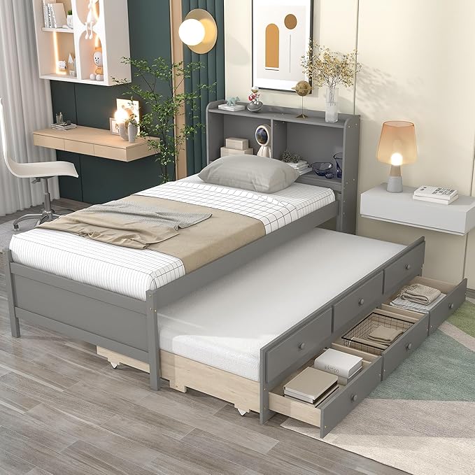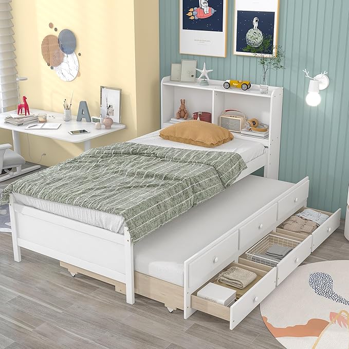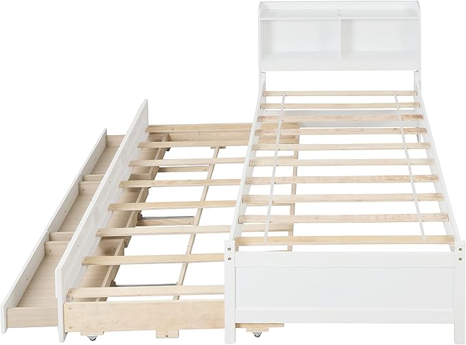 Platform Bed Twin Size with Bookcase Headboard, Trundle and 3 Drawers, Wooden Storage Bedframe for Kids Teens Adults Bedroom
