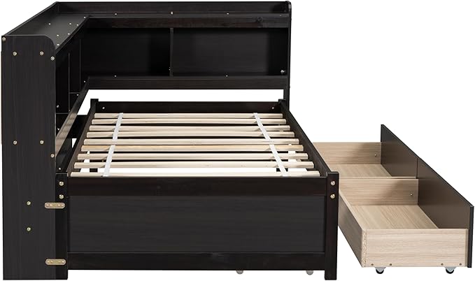 Twin Size Daybed with Storage Drawers and L-Shaped Bookcase Headboard, Solid Wood Captains Day Bed for Bedroom Living Room Guestroom, No Box Spring Needed, Espresso