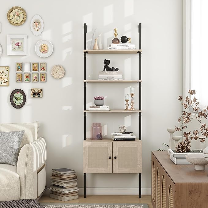 Panana Industrial 5 Tier Ladder Shelf, Open Space Book Shelf Wall Mount Bookshelf with Metal Frame Sturdy Bookcase for Living Room (White, 5 Tier)
