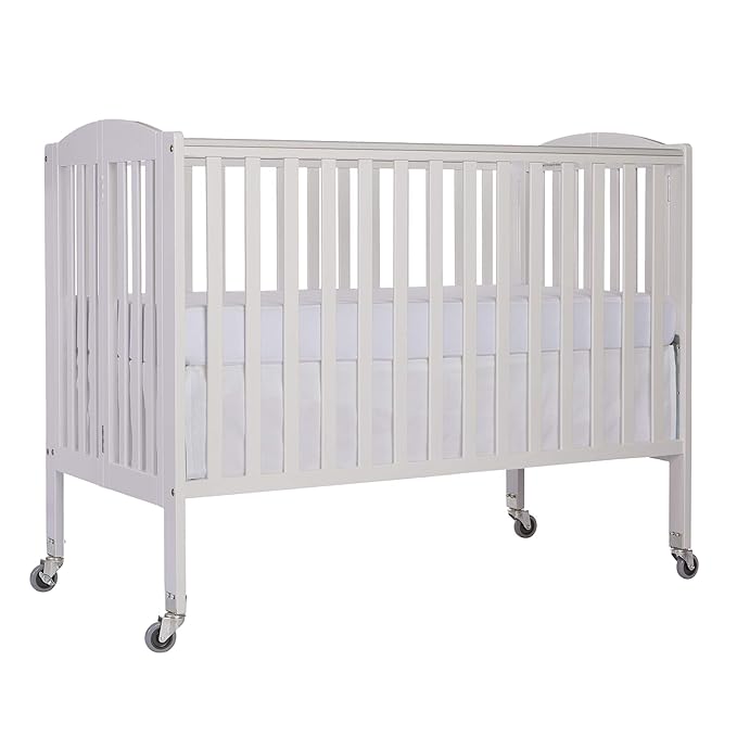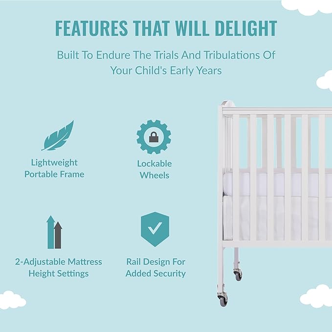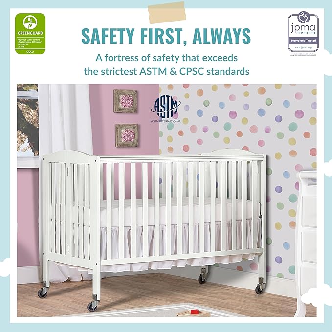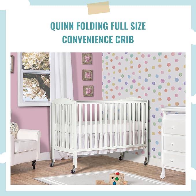 Folding Full Size Convenience Crib In White, Two Adjustable Mattress Height Positions, Comes With Heavy Duty Locking Wheels, Flat Folding Crib