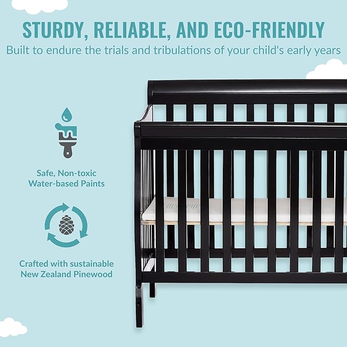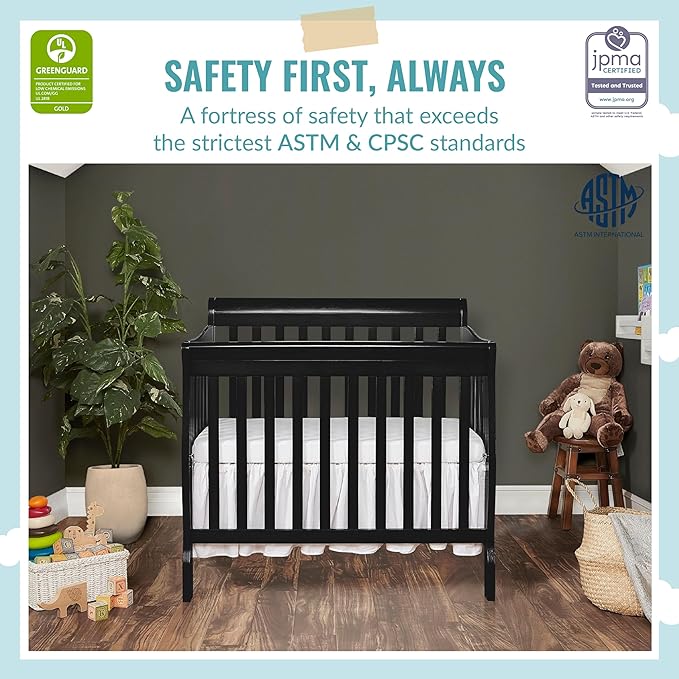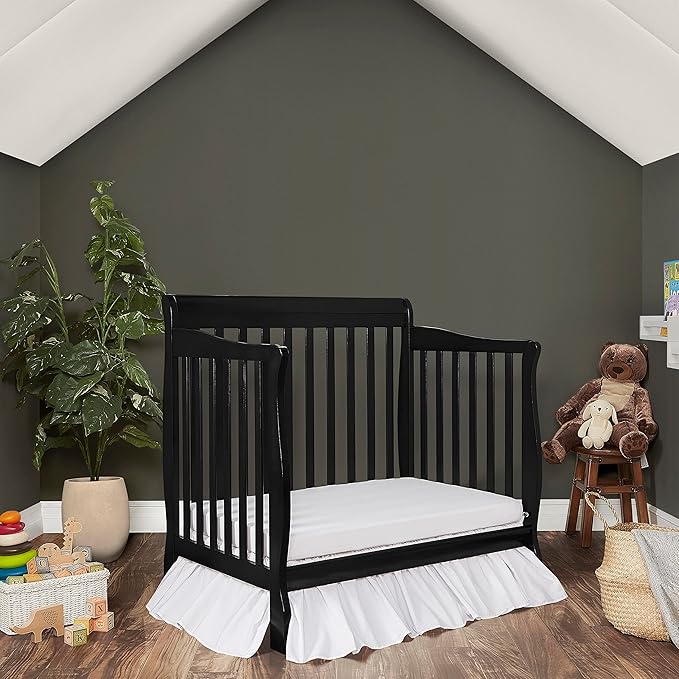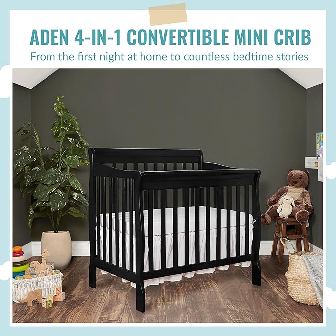 Aden 4-in-1 Convertible Mini Crib In Black, Greenguard Gold Certified, Non-Toxic Finish, New Zealand Pinewood, With 3 Mattress Height Settings