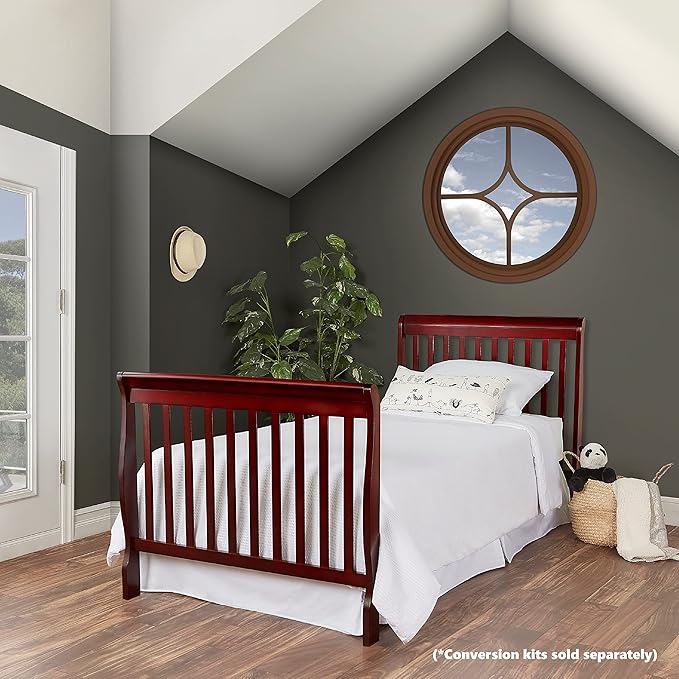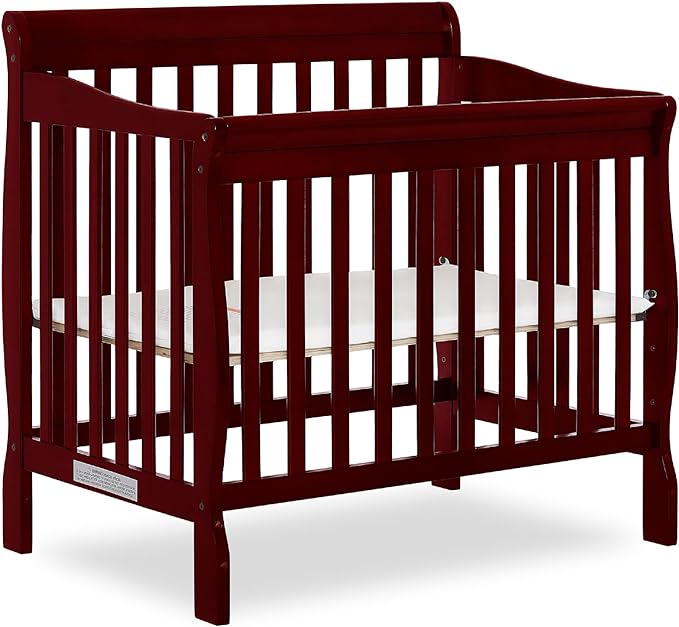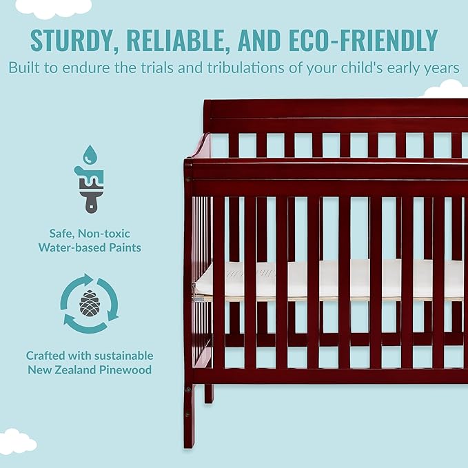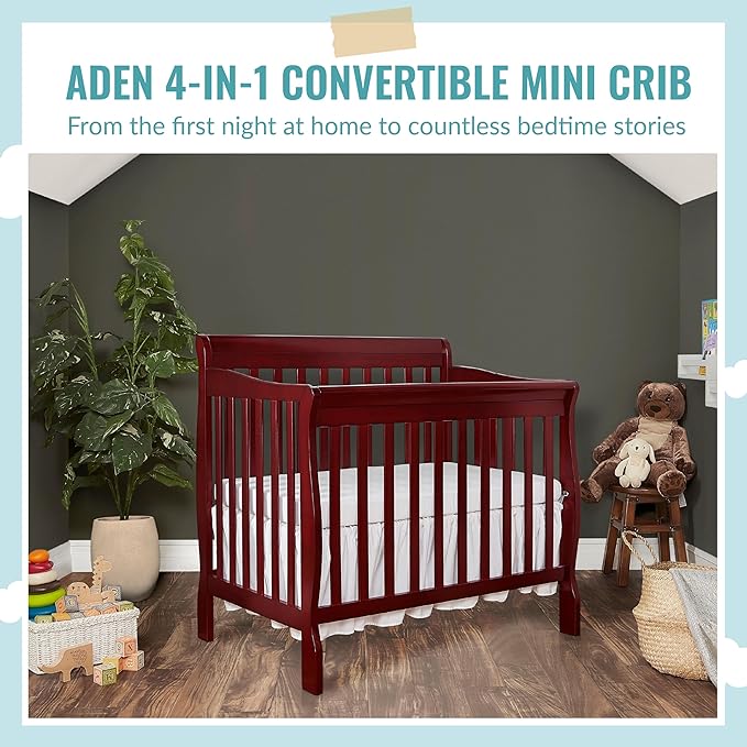 Aden 4-in-1 Convertible Mini Crib In Cherry, Greenguard Gold Certified, Non-Toxic Finish, New Zealand Pinewood, With 3 Mattress Height Settings