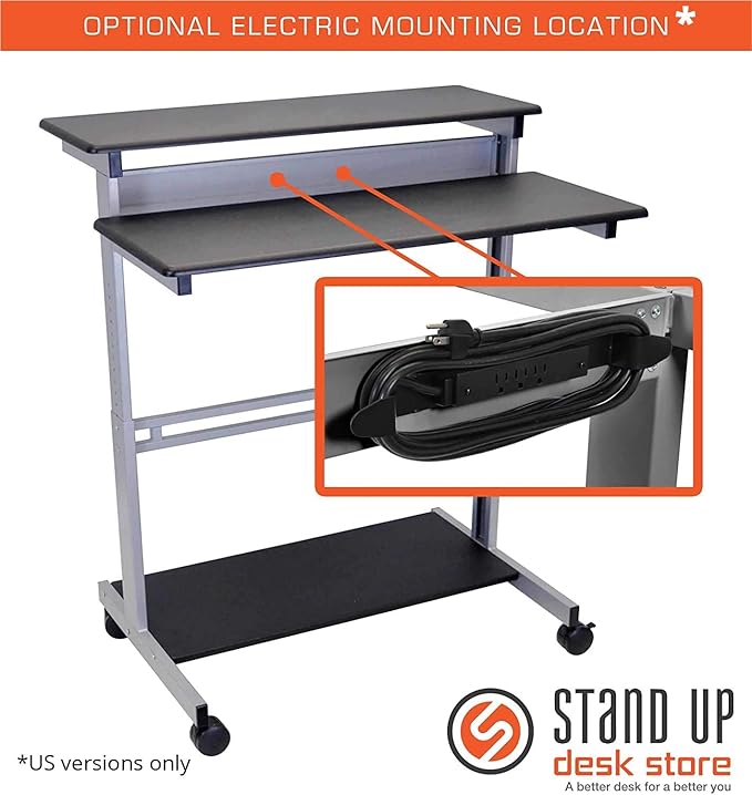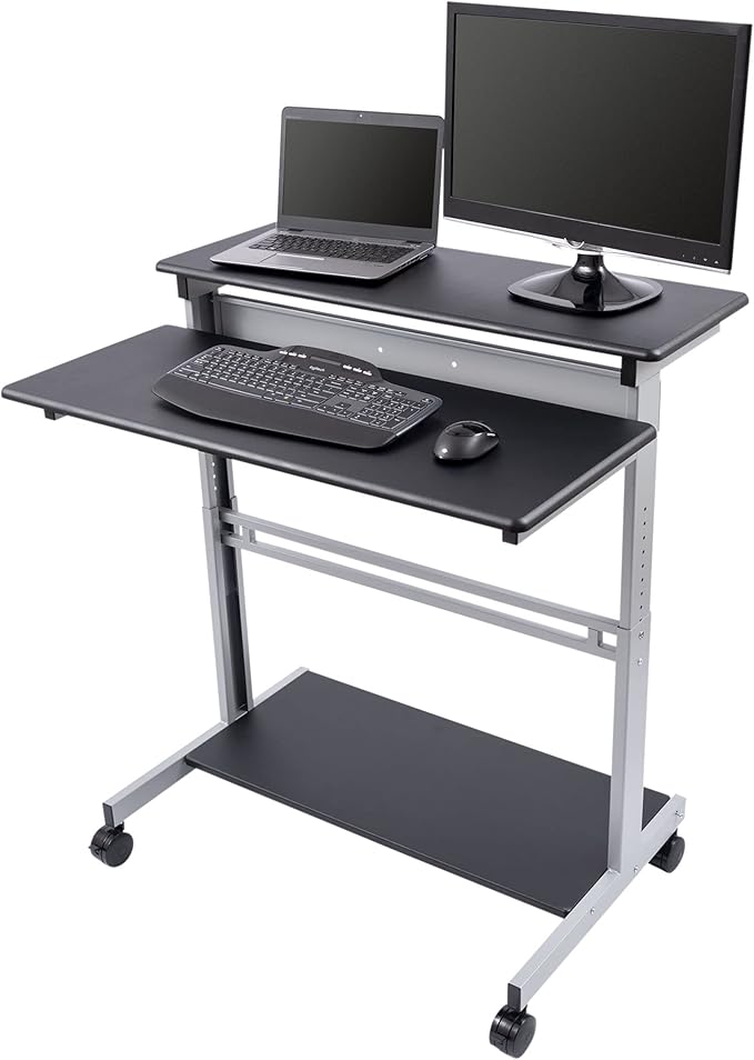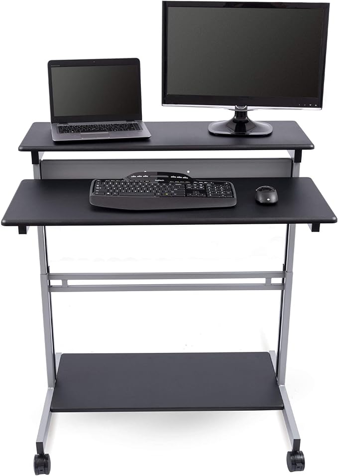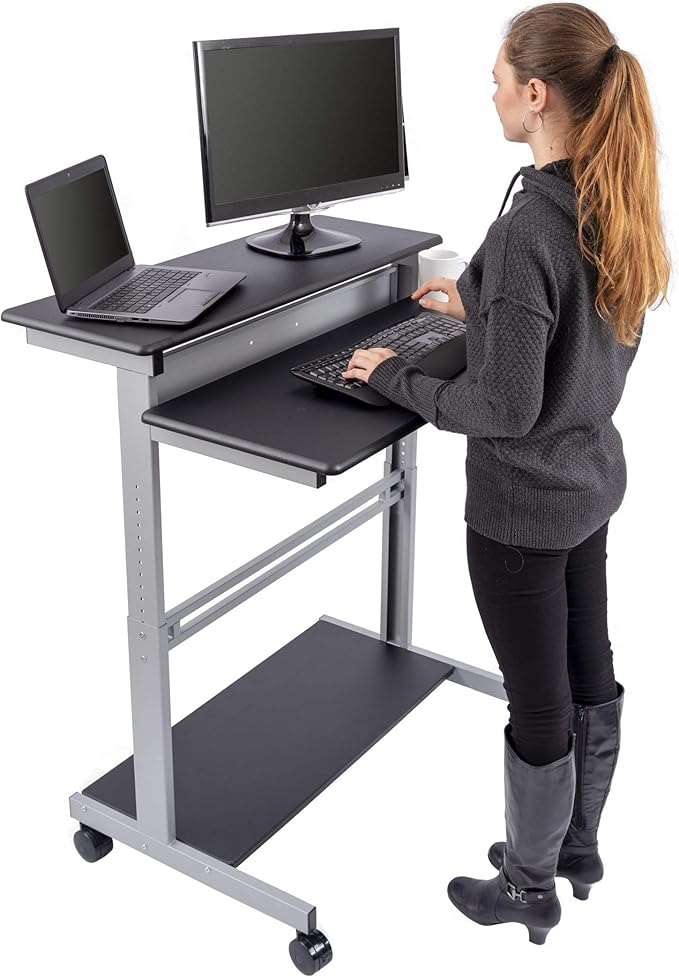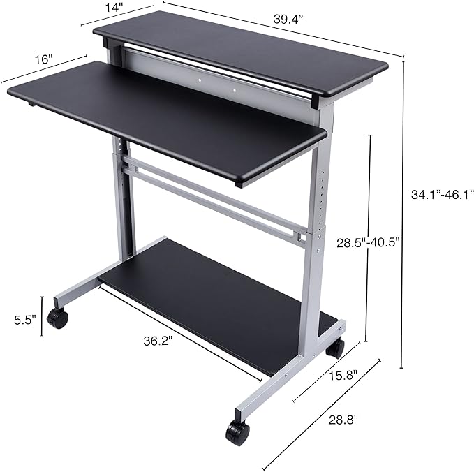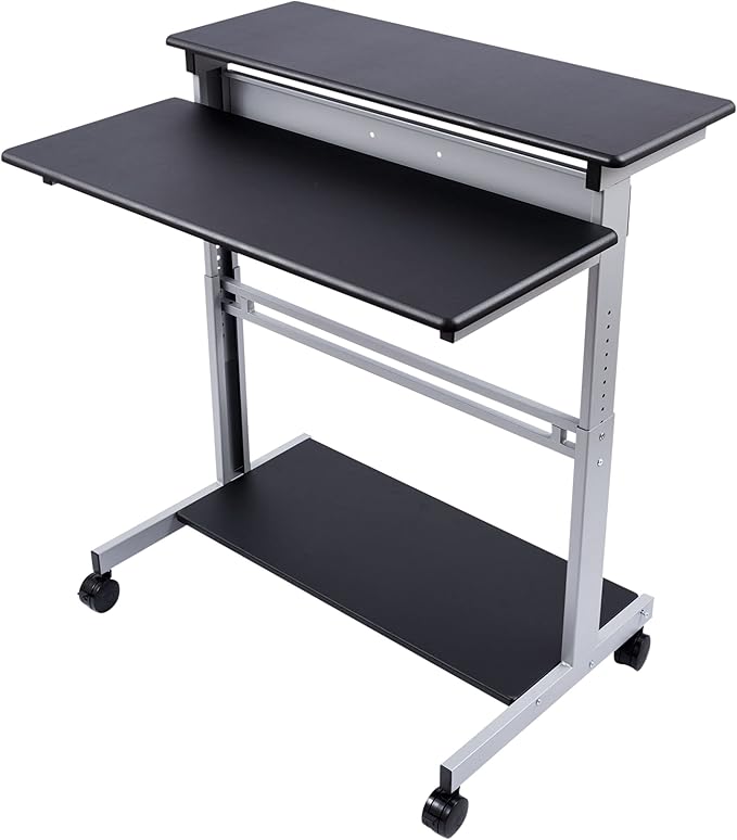Stand Up Desk Store Rolling Adjustable Height Two Tier Standing Desk Computer Workstation (Silver Frame/Black Top, 40" Wide)
