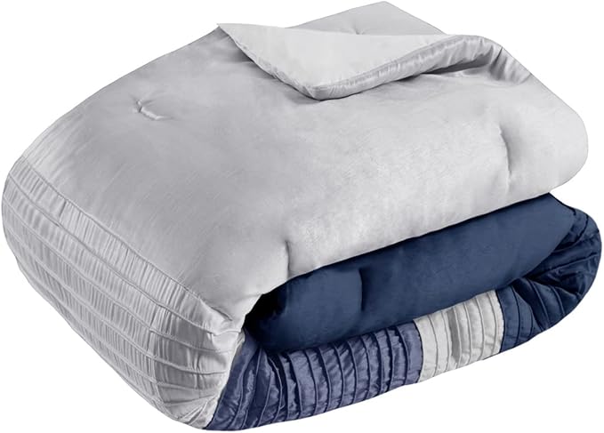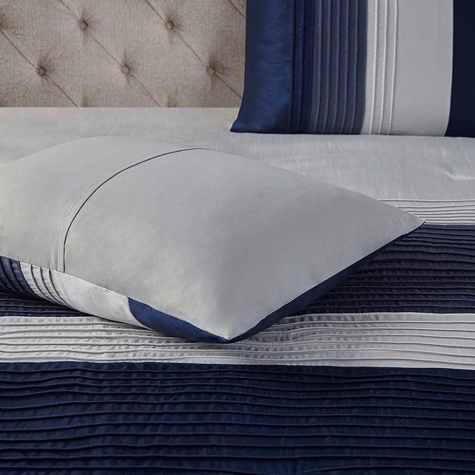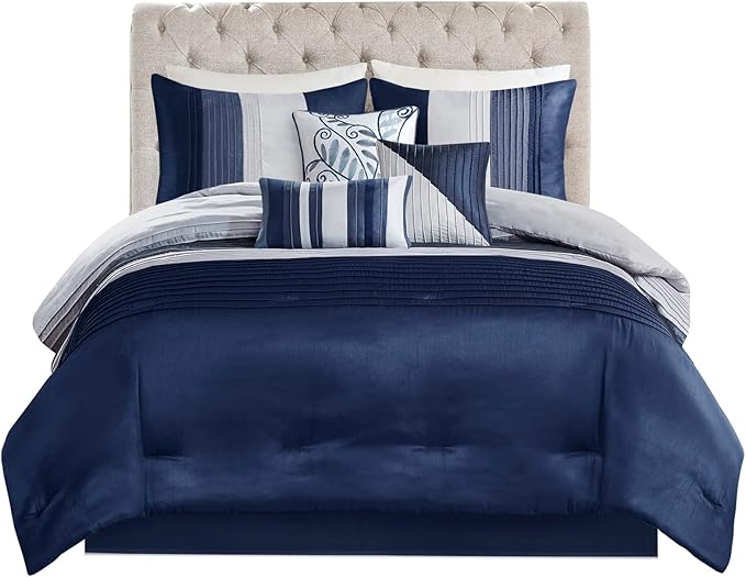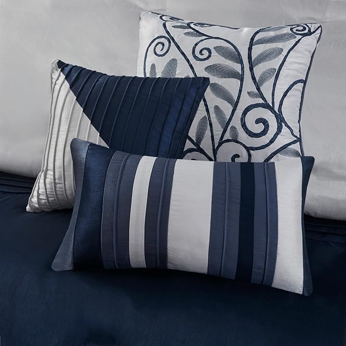 Madison Park Amherst Faux Silk Comforter Set-Casual Contemporary Design All Season Down Alternative Bedding, Matching Shams, Bedskirt, Decorative Pillows, Queen(90"x90"), Navy, 7 Piece (MP10-2207)