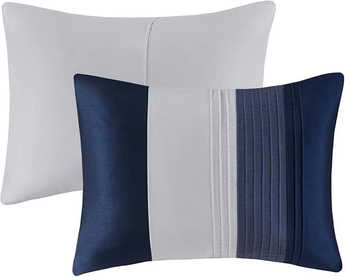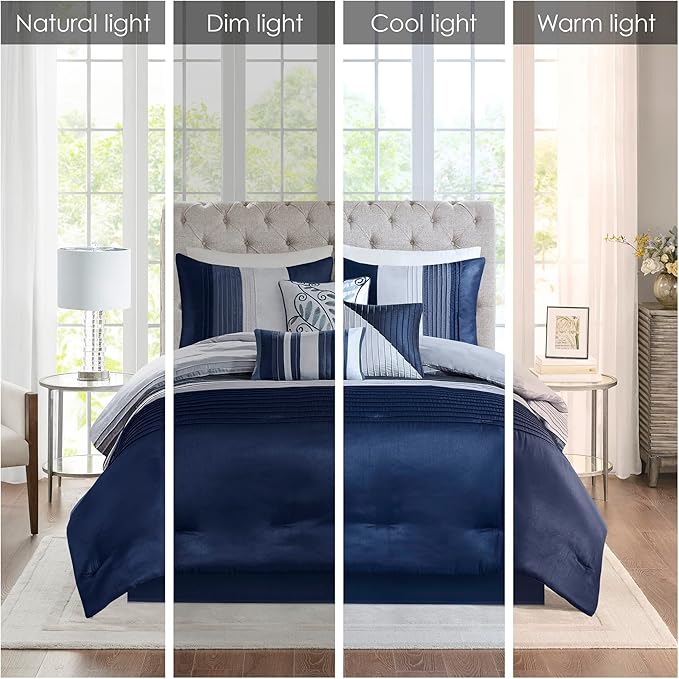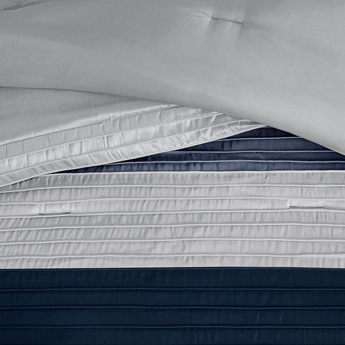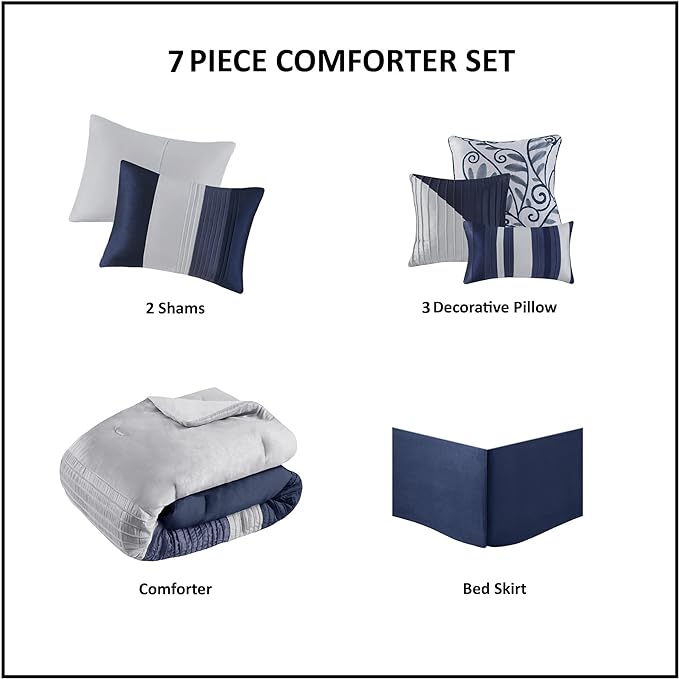 Madison Park Amherst Faux Silk Comforter Set-Casual Contemporary Design All Season Down Alternative Bedding, Matching Shams, Bedskirt, Decorative Pillows, Cal King(104"x92"), Navy, 7 Piece (MP10-2209)