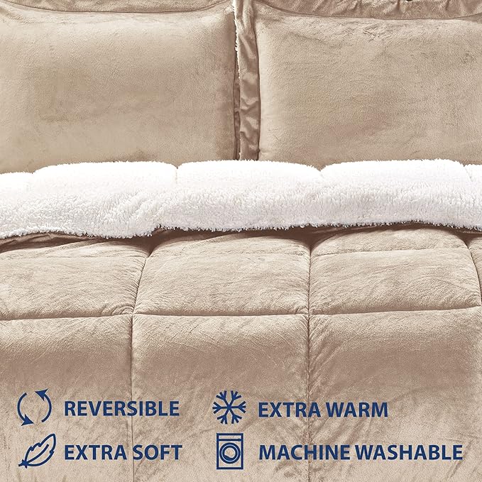 Cathay Home Bedding Sets: Ultra Soft and Plush Reversible Micromink and Sherpa 3-Piece Comforter Set, Camel, Queen (90" x 90")