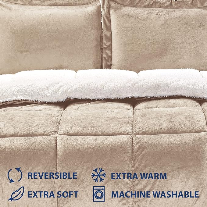 Cathay Home Bedding Sets: Ultra Soft and Plush Reversible Micromink and Sherpa 3-Piece Comforter Set, Camel, King (102" x 90")