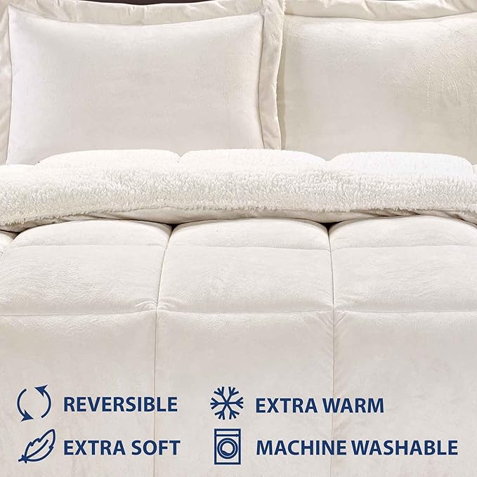 Cathay Home King Comforter Set: Ultra Soft and Plush Reversible Micromink and Sherpa 3-Piece Bedding Set, Ivory, King (102" x 90")