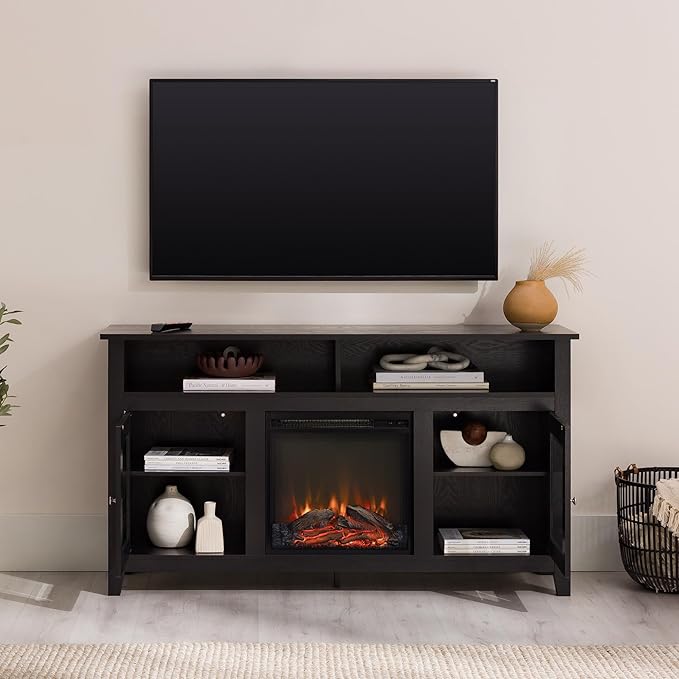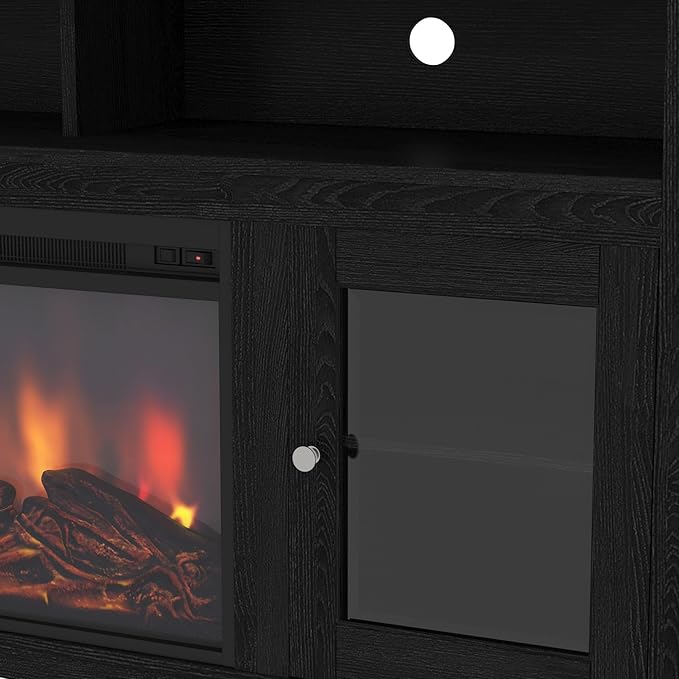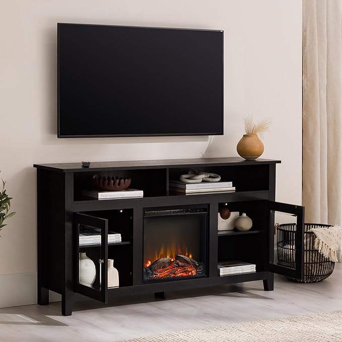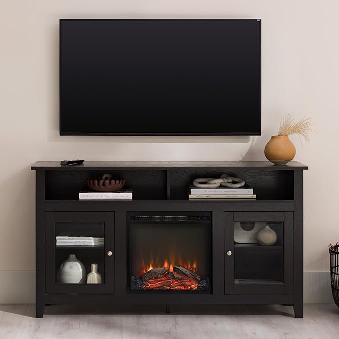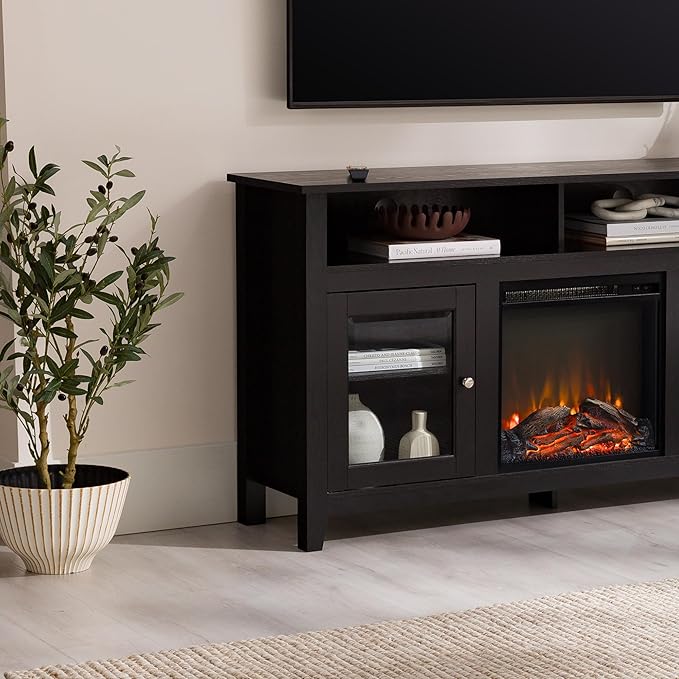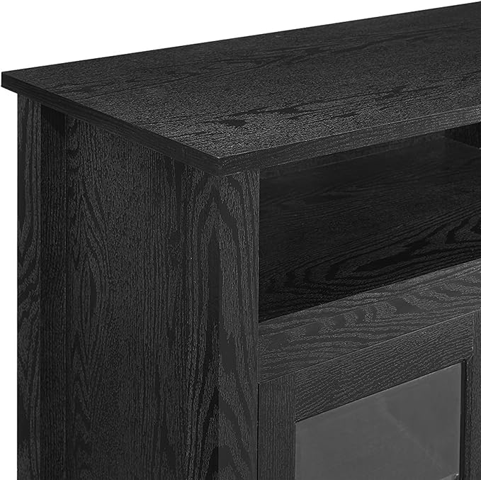 Walker Edison Glenwood Rustic Farmhouse Glass Door Highboy Fireplace TV Stand for TVs up to 65 Inches, 58 Inch, Black
