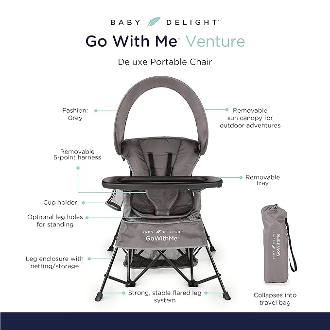 Baby Delight Go with Me Venture Portable Chair | Indoor and Outdoor | Sun Canopy | 3 Child Growth Stages | Grey