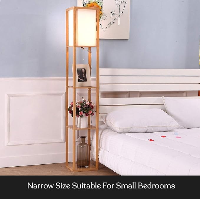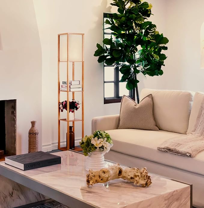 Brightech Maxwell - Modern Shelf Floor Lamp with Lamp Shade and LED Bulb - Corner Display Floor Lamps with Shelves for Living Room, Bedroom and Office - Natural Wood