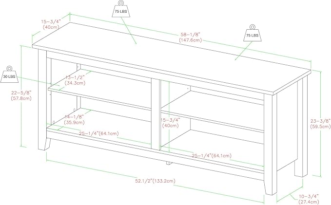 About This Wood Dimensions: 23.375” H x 15.75” D x 58” L, Open storage cubby: 15.75” H x 14” D...