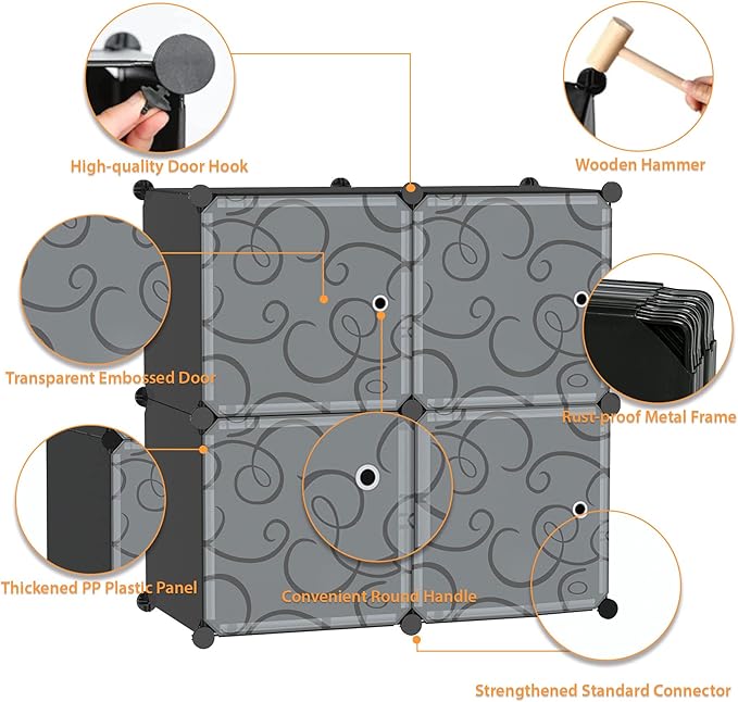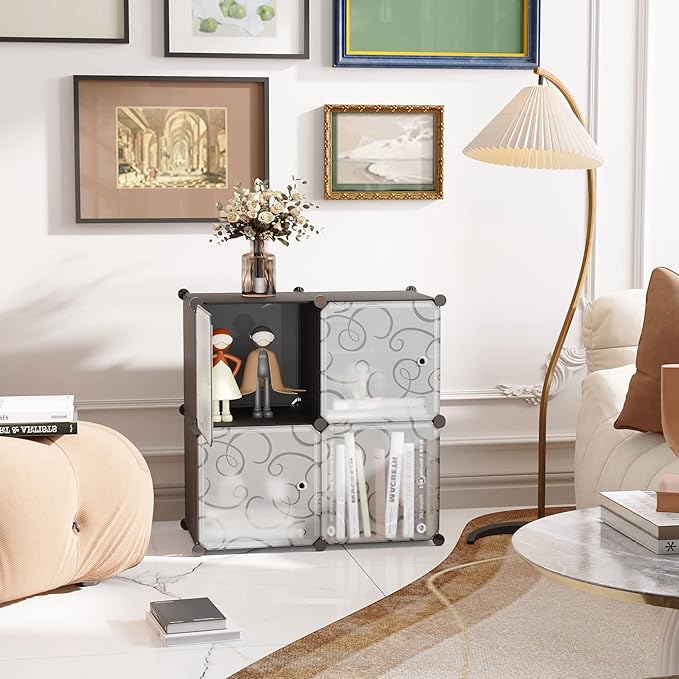 C&AHOME Cube Storage Organizer with Doors, 4-Cube Shelves, Closet Cabinet, DIY Plastic Modular Bookshelf Ideal for Bedroom, Living Room, 24.8" L x 12.4" W x 24.8" H Black SHS04B-DOOR