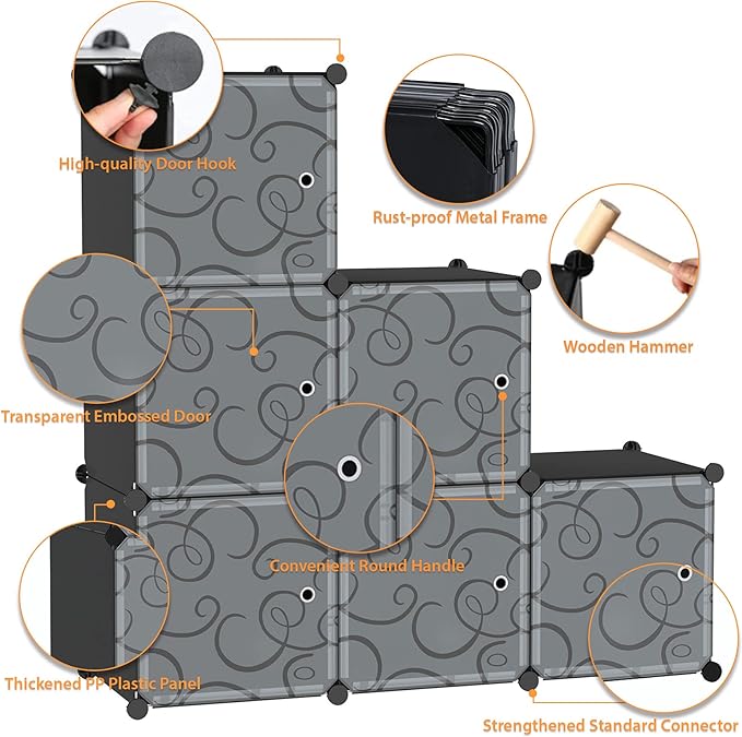 C&AHOME Cube Storage Organizer with Doors, 6-Cube Shelves, Closet Cabinet, DIY Plastic Modular Bookshelf Ideal for Bedroom, Living Room, 36.6”L x 12.4”W x 36.6”H Black SHS3006B-DOOR