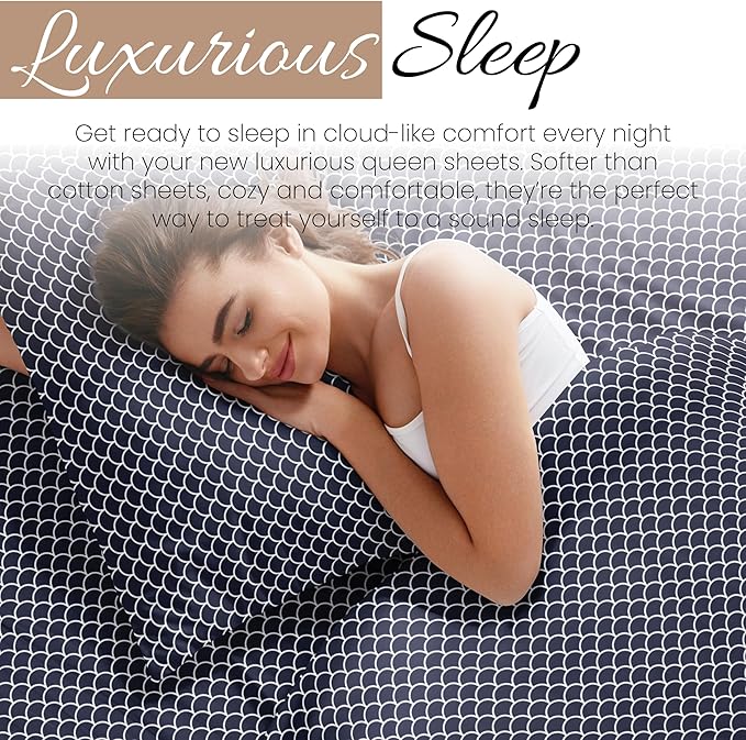 Linen Market 4 Piece Sheet Set Patterned, Queen, Scallop Navy