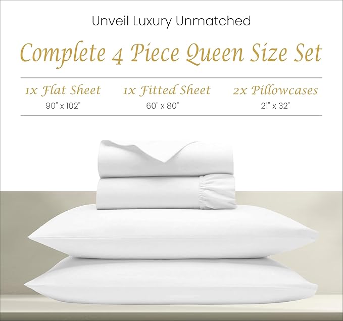 Bluemoon Homes 100% Egyptian Cotton Sheets Queen Size - 1000 Thread Count Sheets Queen Size Bed Sheet Set, Long Staple Bedding Sheets, Sateen Weave, Fits Upto 18" Mattress - White Queen Sheets