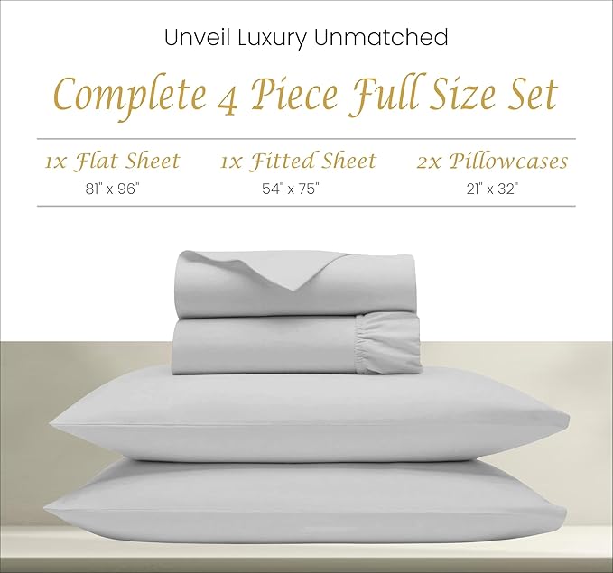 Egyptian Cotton Sheets Full Size - 1000 Thread Count Sheets for Full Size Bed, Long Staple Comfortable Luxury & Soft, 4-Piece Coziest Bedding Set, Fits Upto 18" Mattress - Light Grey Sheets