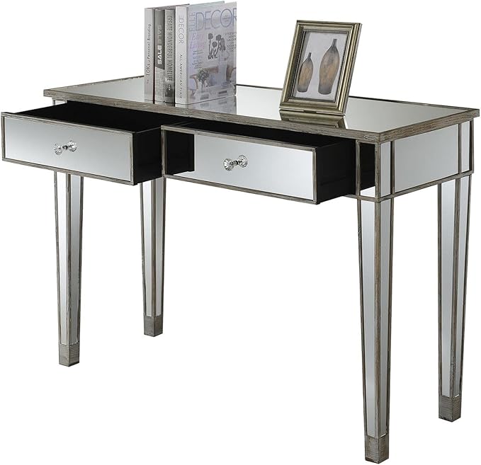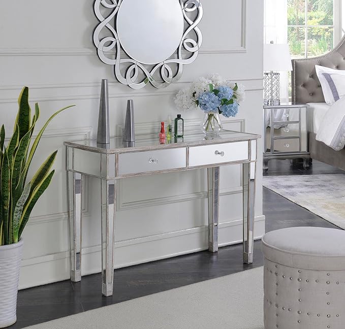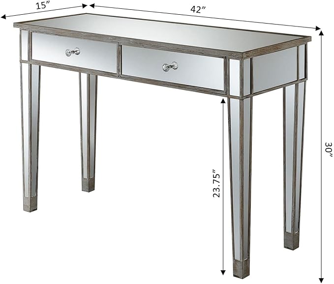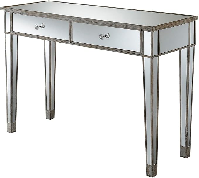 Convenience Concepts Gold Coast Mirrored Desk 42" - Console Table with 2 Drawers for Storage in Living Room, Office, Weathered White/Mirror