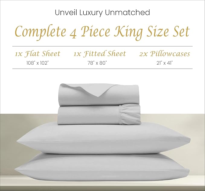 1000 Thread Count Egyptian Cotton Sheets - Luxury Sheets King Size Egyptian Cotton Sheets, 4Pc Sateen Weave King Sheets, Hotel Sheets & Pillowcase Set, 18" Deep Pocket King Sheet Set - Light Grey