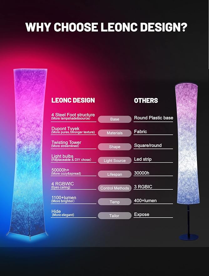LEONC 61" Soft Light Floor Lamp for Game Room and TV, RGB Color Changing LED, Tyvek Fabric Shade, Smart App Control, Compatible with Alexa & Google Home, Music Sync and Multi Scene Modes,Floor Lamp