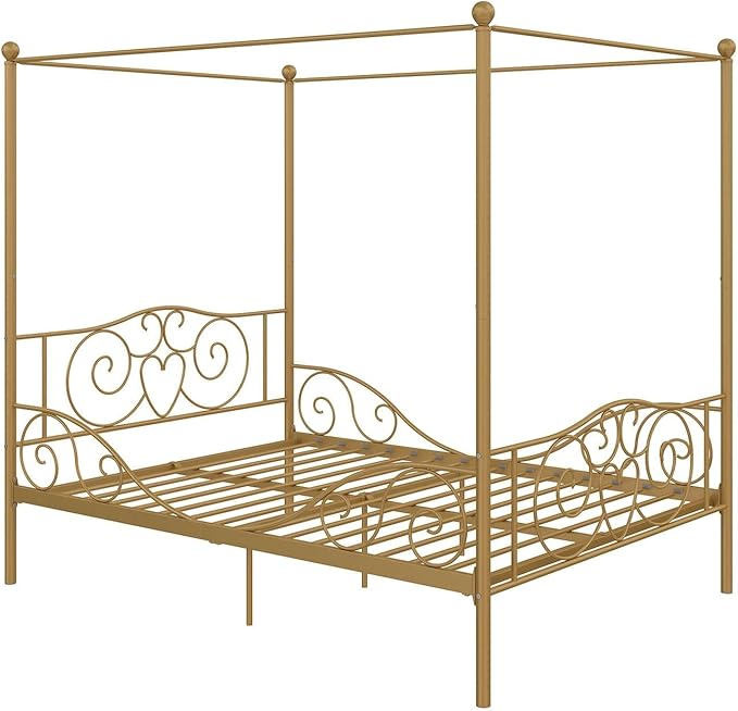 DHP Metal Canopy Kids Platform Bed with Four Poster Design, Scrollwork Headboard and Footboard, Underbed Storage Space, No Box Sring Needed, Full, Gold