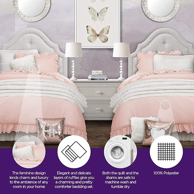 Lush Decor Reyna Ruffle Comforter Set - 3 Piece Cozy Ruffled Bedding Set - Timeless Elegance and Comfort for Bedroom - King, Blush