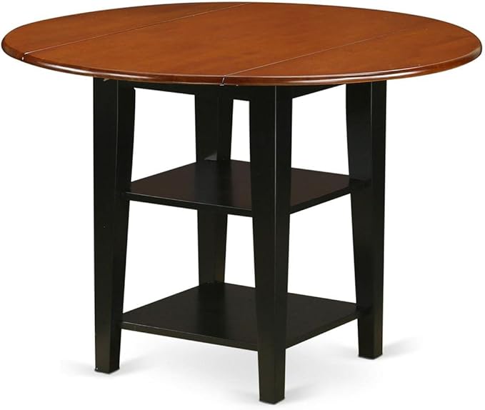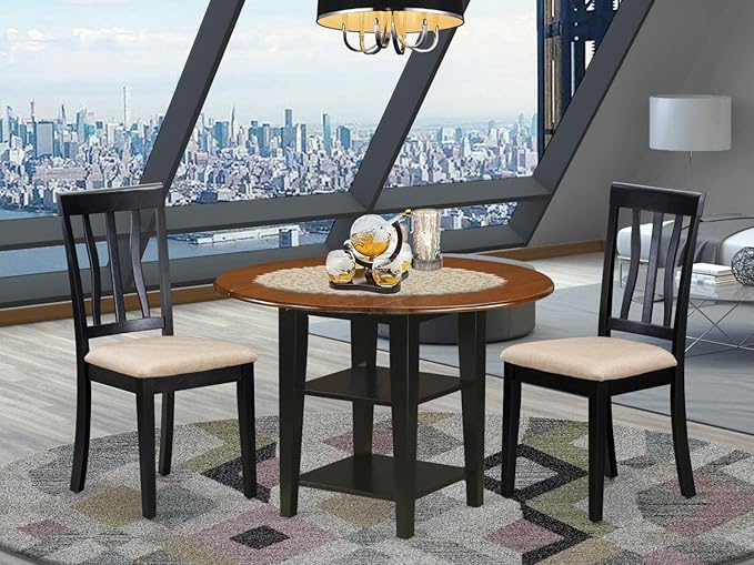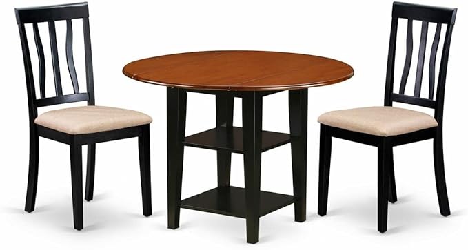 East West Furniture SUAN3-BCH-C 3 Piece Dining Room Table Set Contains a Round Kitchen Table with Dropleaf & Shelves and 2 Linen Fabric Upholstered Chairs, 42x42 Inch, Black & Cherry