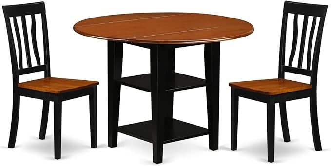 East West Furniture SUAN3-BCH-W 3 Piece Dining Room Table Set Contains a Round Dining Table with Dropleaf & Shelves and 2 Wood Seat Chairs, 42x42 Inch, Black & Cherry