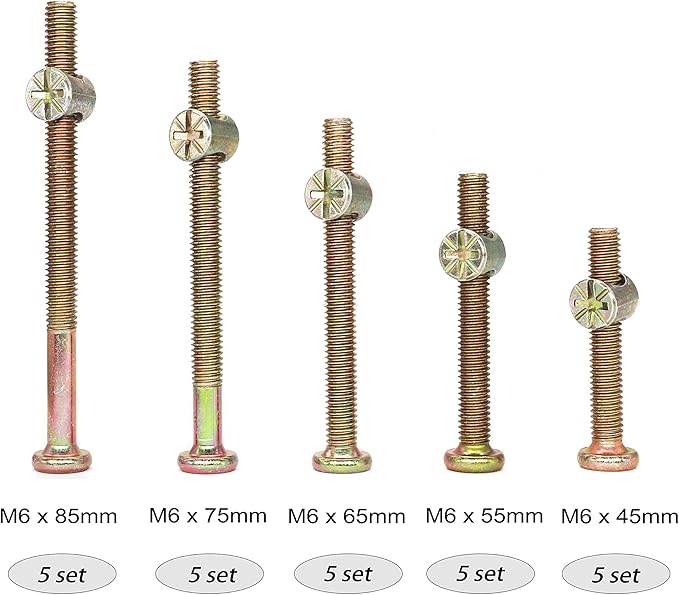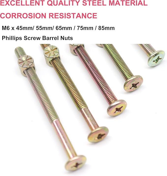 25-Set M6 Phillips Head Bolts Barrel Nuts Assortment Kit for Chairs Furnitures, Bunk Bed Crib Hardware Replacements Kit, M6x45mm/ 55mm/ 65mm/ 75mm/ 85mm Zinc Plated