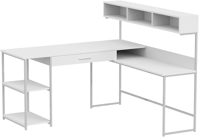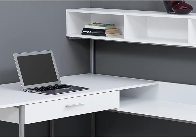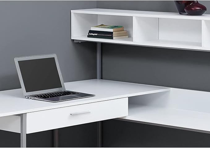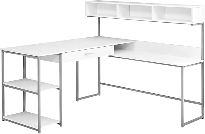 Monarch Specialties Workstation for Home & Office with Multiple Shelves and Drawer L-Shaped Corner Desk with Hutch, 60" L, White/Silver Frame