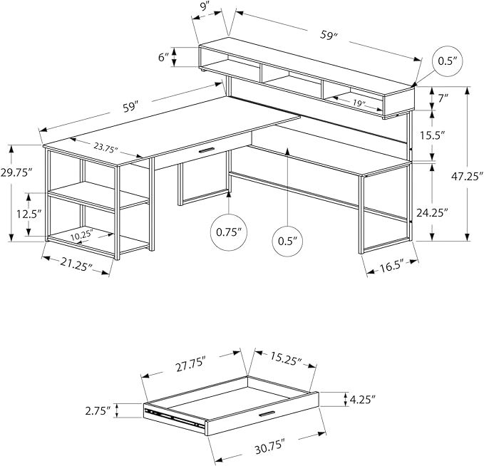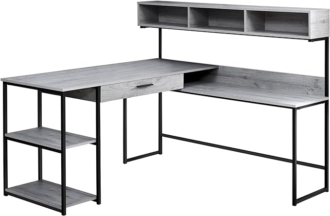 Monarch Specialties Workstation for Home & Office with Multiple Shelves and Drawer L-Shaped Corner Desk with Hutch, 60" L, Grey/Black Frame