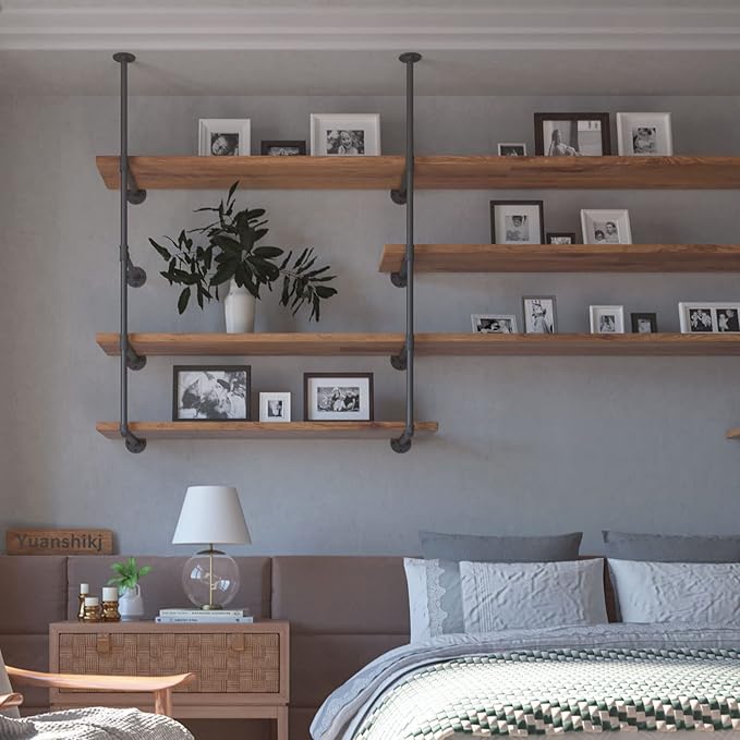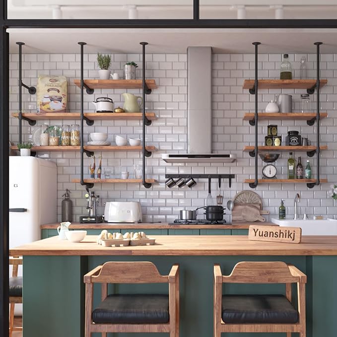Yuanshikj 2Pc (42" tall 12" deep, 3/4") Industrial Wall Mount iron Pipe Shelf Shelves Shelving Bracket Vintage Retro Black DIY Open Bookshelf Storage Home Kitchen (2 Pcs 3Tier Hardware only)