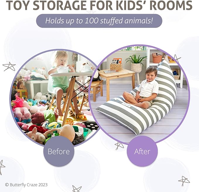 Butterfly Craze Bean Bag Chair Cover, Functional Toddler Toy Organizer, Fill with Stuffed Animals to Create a Jumbo, Comfy Floor Lounger for Boys or Girls, Stuffing Not Included, Grey Stripe