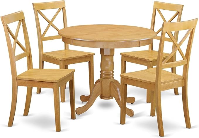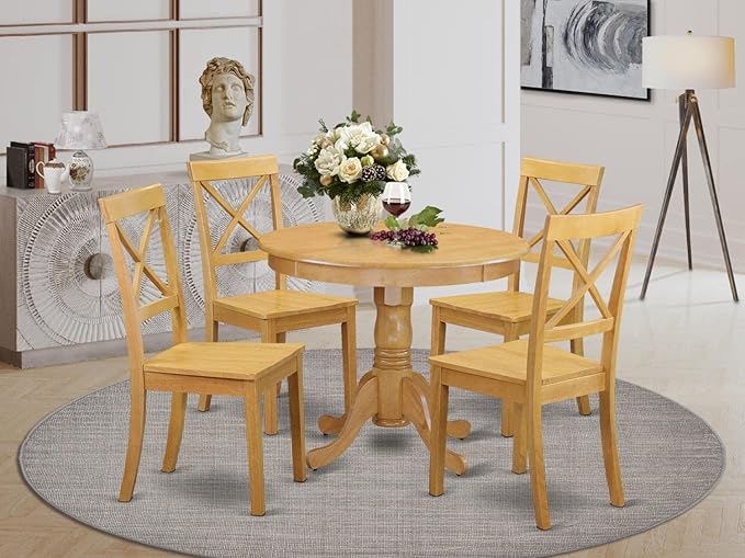 East West Furniture ANBO5-OAK-W Antique 5 Piece Modern Set Includes a Round Kitchen Table with Pedestal and 4 Dining Chairs, 36x36 Inch